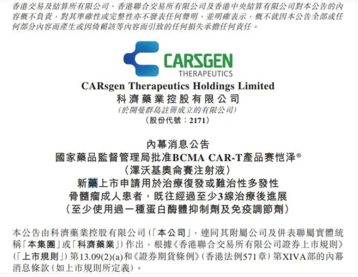 3月1日,科济药业宣布,公司产品泽沃基奥仑赛注射液已获得国家药品监督管理局批准上市。泽沃基奥仑赛注射液是一款自体BCMA靶向CAR-T细胞产品,用于复发或难治性多发性骨髓瘤成人患者的治疗。