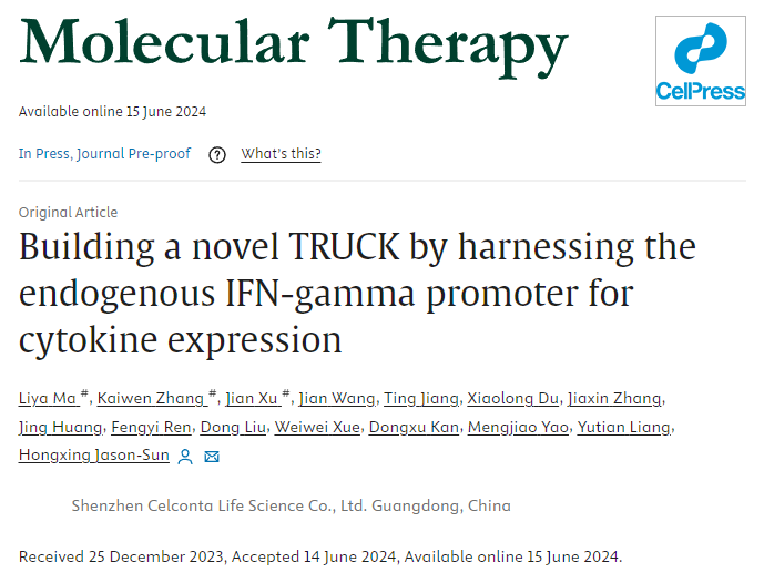 近日,深圳市八大胜生命科学有限公司(以下简称“八大胜生命”)在CAR-T细胞治疗实体瘤领域的研究取得重大进展。其研究论文《Building a novel TRUCK by harnessing the endogenous IFN-gamma promoter for cytokine expression》成功被国际权威学术期刊《Molecular Therapy》收录并发表。这标志着八大胜生命在细胞治疗领域取得了全球性突破,不仅彰显了八大胜生命在技术创新方面的雄厚实力和行业领先地位,也为同行提供了新的科研视角和实验手段,有望加快细胞药物的开发进程。