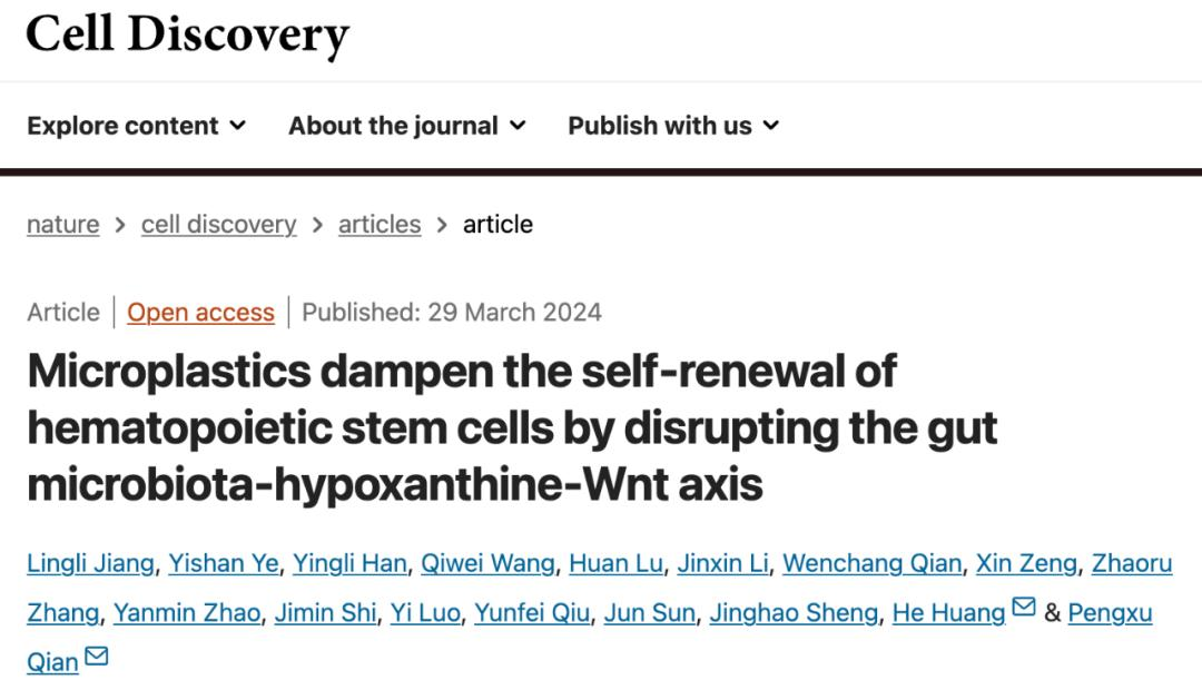 日前,浙江大学医学院/良渚实验室钱鹏旭研究、黄河教授团队在 Cell Discovery 期刊发表研究论文。该研究揭示了微塑料通过破坏肠道微生物群-次黄嘌呤-Wnt信号轴来抑制造血干细胞的自我更新。
