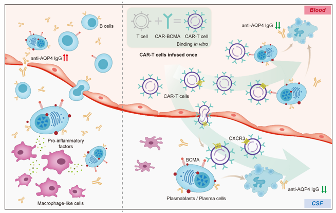 研究还发现CAR-T细胞治疗中枢神经的免疫异常的关键,即具有趋化特性的CAR-T细胞更容易穿透血脑屏障进入中枢神经,直接杀伤中枢神经系统的异常浆细胞,减少鞘内自身抗体的分泌以及免疫细胞的异常激活,从而调节视神经脊髓炎谱系疾病患者中枢神经系统免疫紊乱状态,利于患者的中枢神经免疫重建。