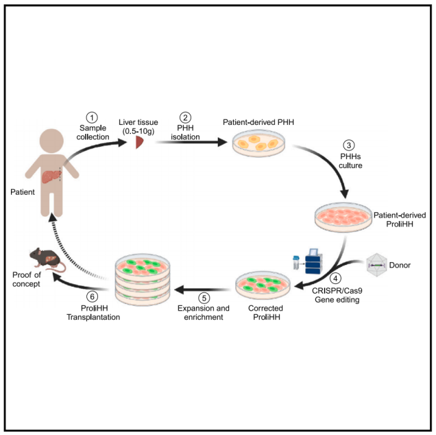 基因编辑技术的进步使转基因在人类原代细胞中的精确整合成为可能,扩大了实验和临床细胞治疗的范围。通过CRISPR-Cas9靶向CAR-T细胞治疗淋巴瘤已被证明具有很高的安全性和有效性。然而,确定一种有效的方法靶向大的DNA cargo到肝细胞仍然是难以捉摸的。使用同源定向修复(HDR)模板编辑肝细胞的尝试导致低靶向性(<1%)和高毒性扩大患者源性肝细胞、优化靶向策略和使用腺相关病毒(AAV)的模板递送可能解决这些问题。因此,系统探索这些关键条件可能实现有效的靶向整合,促进自体肝细胞治疗的发展。