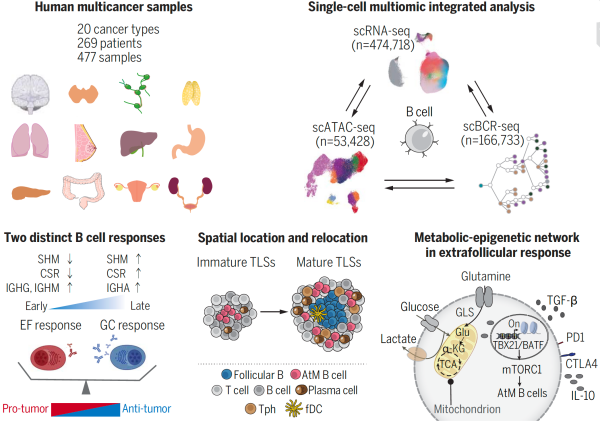 这一成果创新性地描绘了多癌种B细胞的转录组、BCR免疫组库和表观组的单细胞多组学图谱,揭示了肿瘤浸润B细胞存在抗肿瘤与促肿瘤不同的应答模式,并分析了肿瘤浸润AtM B细胞的分子特征、分化路径、空间定位、癌种特异性及临床相关性,提出了靶向抑制滤泡外B细胞应答、促进抗肿瘤免疫的免疫治疗新方向。