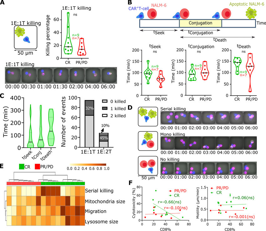 在该研究中,研究人员使用了TIMING(纳米阱网格延时成像显微镜技术,Timelapse Imaging Microscopy in Nanowell Grids)方法,其能应用视觉AI来评估细胞的行为、运动和杀伤能力。研究结果表明,被标记为CD8合身T细胞的T细胞亚群具有高度的运动型和连续杀伤能力,其其能在有临床反应的患者中被发现。为了发现CD8合身细胞(CD8-fit cells),研究人员利用TIMING来追踪数千个细胞中单一T细胞和肿瘤细胞之间的相互作用,并将结果与单细胞RNA测序数据进行结合分析。