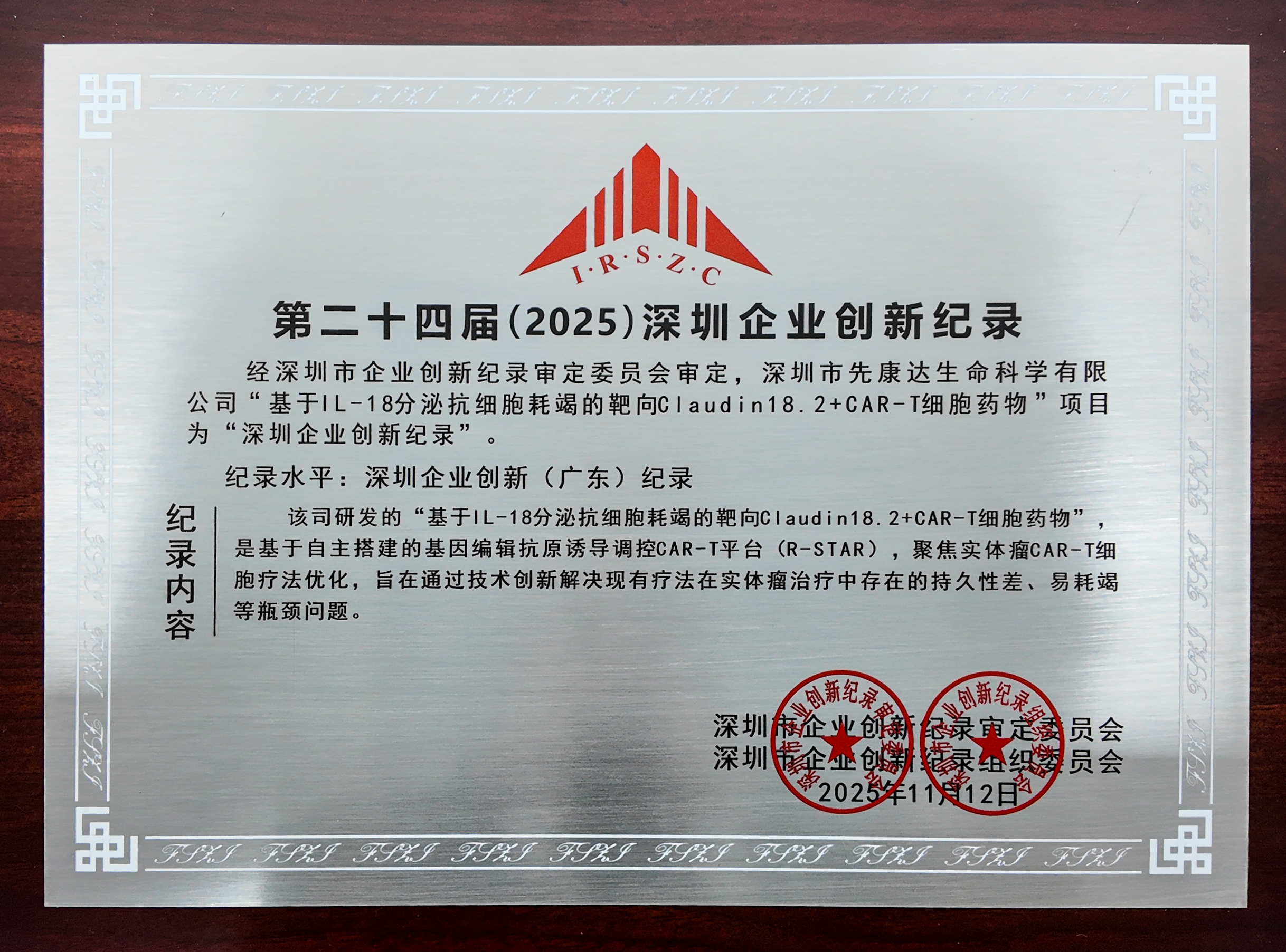 近日,经深圳市企业创新纪录审定委员会严谨审定,深圳市八大胜生命科学有限公司(以下简称“八大胜生命”)“基于IL-18分泌抗细胞耗竭的靶向Claudin18.2+CAR-T细胞药物”项目,成功获评“深圳企业创新纪录”,纪录水平达深圳企业创新(广东)纪录。